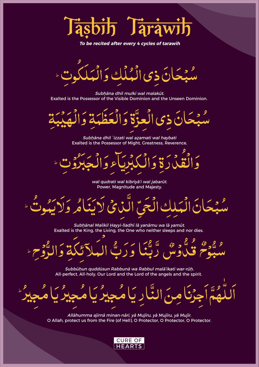 This du'ā', commonly known as the tarāwīh du'ā', is as follows however, some parts of the above du'ā' are mentioned in several books of tafsīr as the tasbīh of the angels12 yet, none of the books tasbih. The holy month of ramadan tasbeeh taraweeh dua in urdu and arabic.